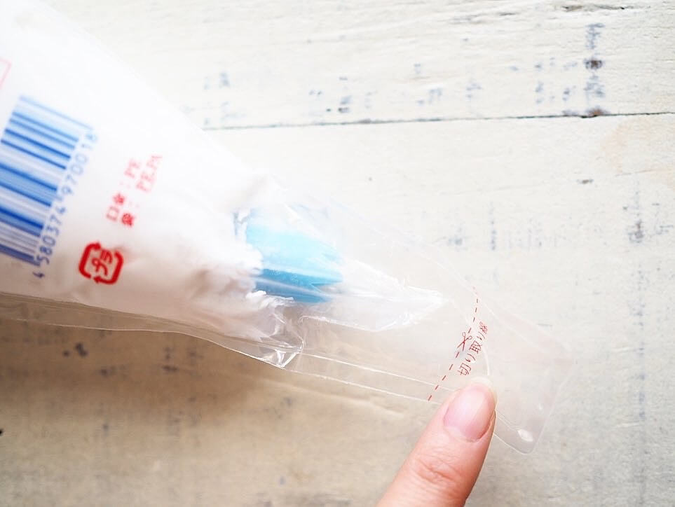 袋自体が絞り袋になっていて、下の切り取り線でカットすれば絞り口からクリームを出すことができます。