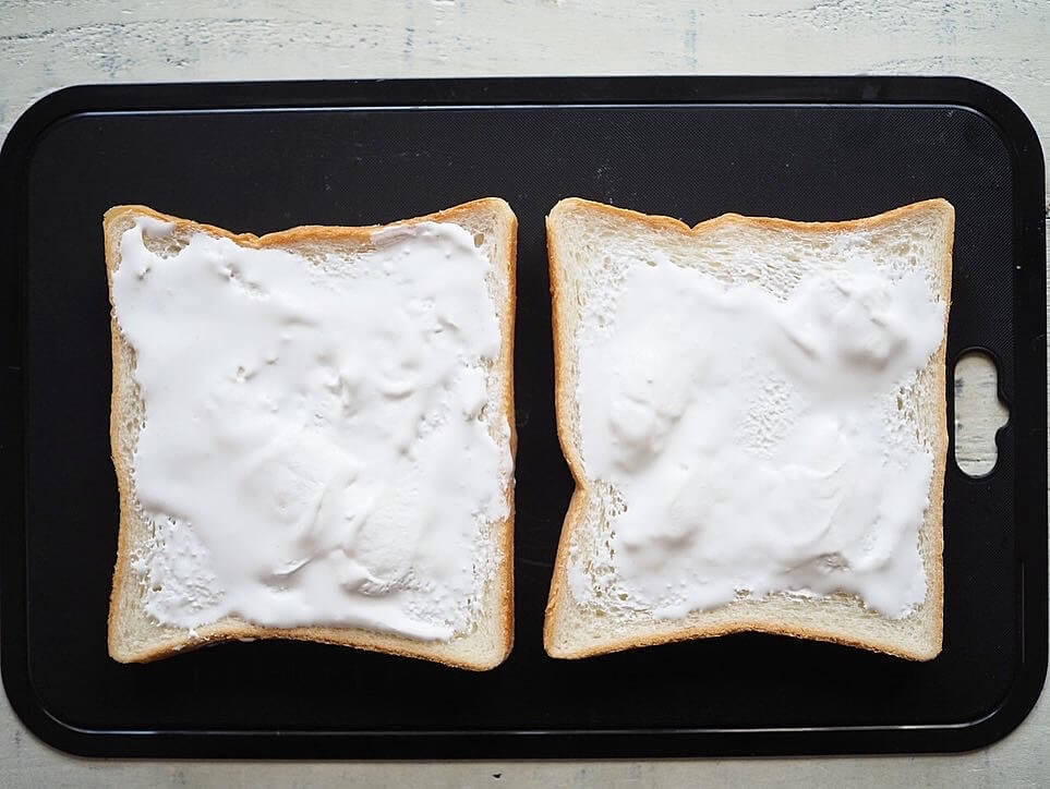 同じく業務スーパーの定番商品「朝の輝き 8枚切」(65円・税抜)を2枚並べて、ホイップを片面にまんべんなく塗ります。