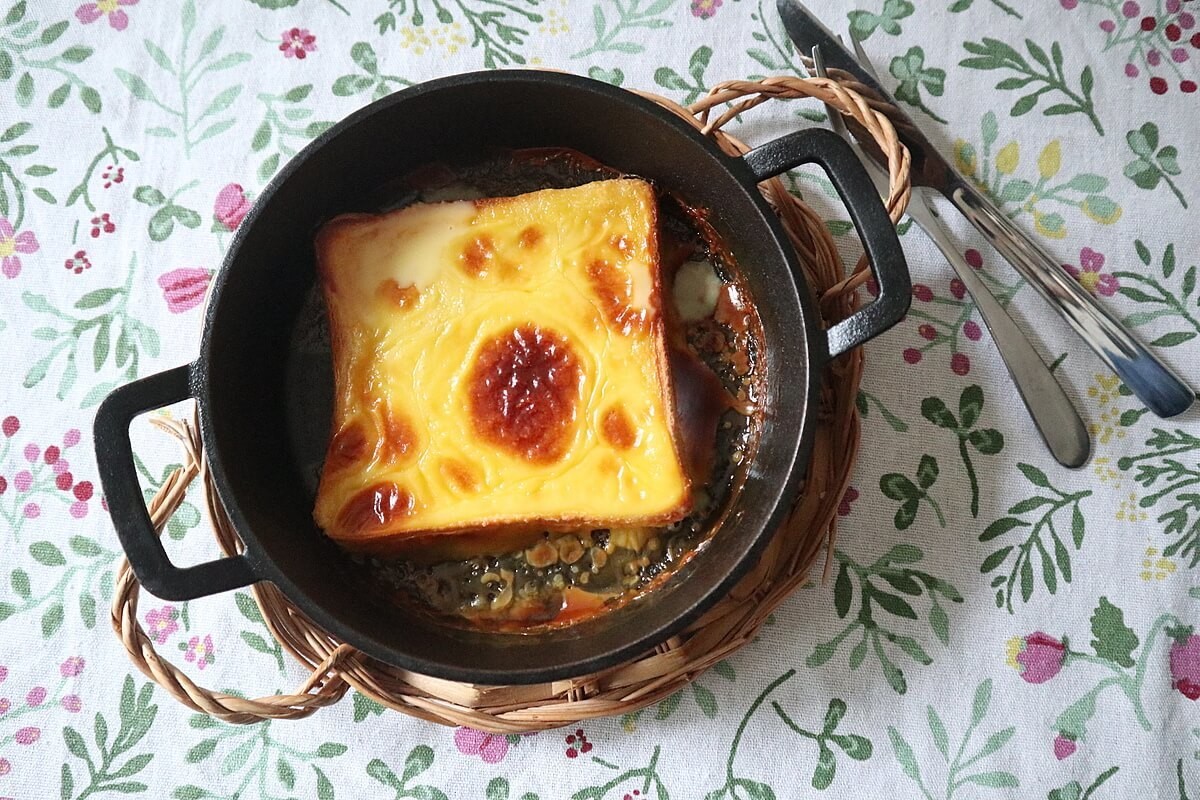 スキレットやグラタン皿に食パンを入れて、プリン1食分をのせて、オーブントースターで焼くだけ。