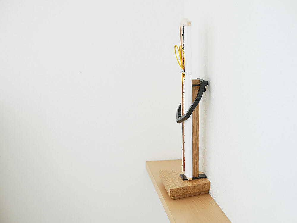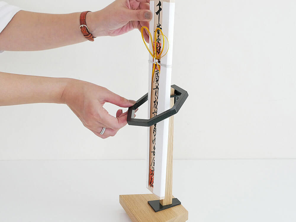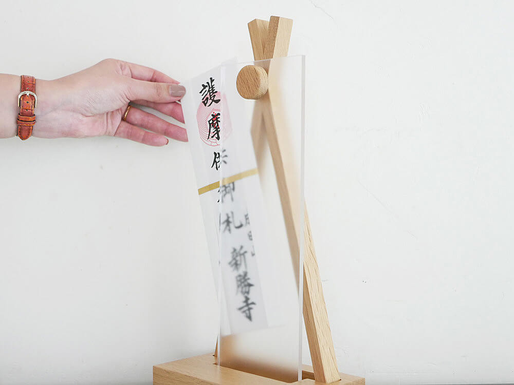 上部の丸いつまみがネジ式になっており、アクリル板と御札を重ねて本体の溝へ差し込み、ネジで止めるだけ。