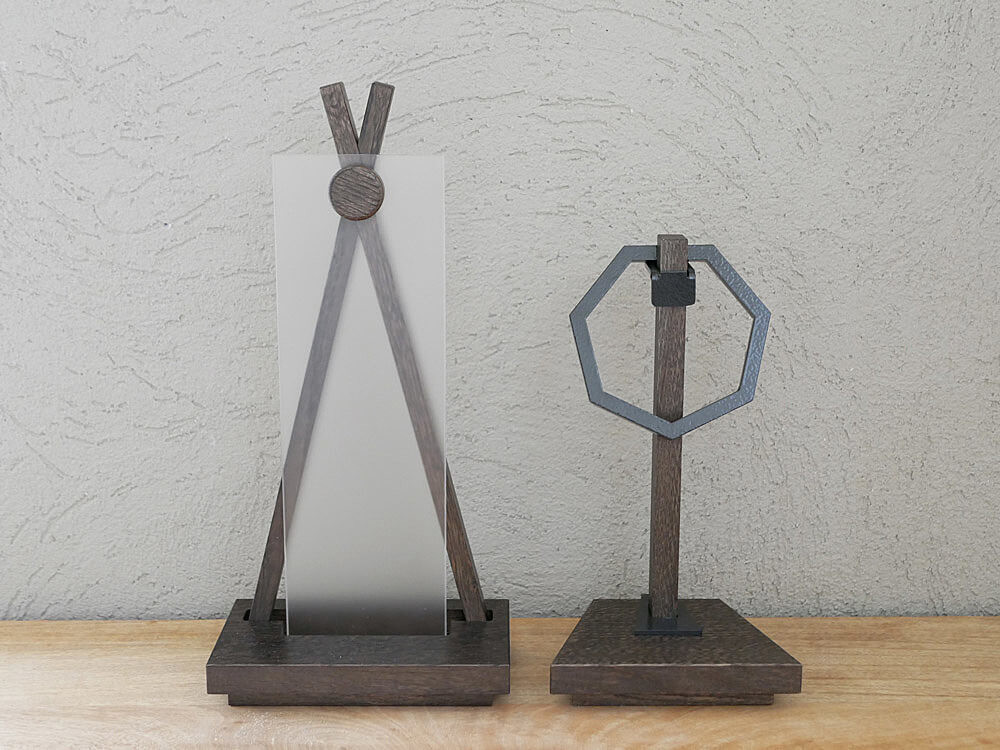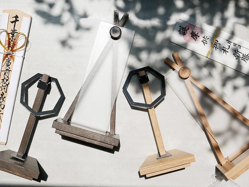 「OFUDAZA」と「KIFUDAZA」は神社建築の特徴である千木と鰹木をモチーフに、神聖なたたずまいを見せながらも、暮らしの様々な空間に溶けこみ、誰でも簡単にきちんとお祀りできる新しい神棚の考え方として開発されました。