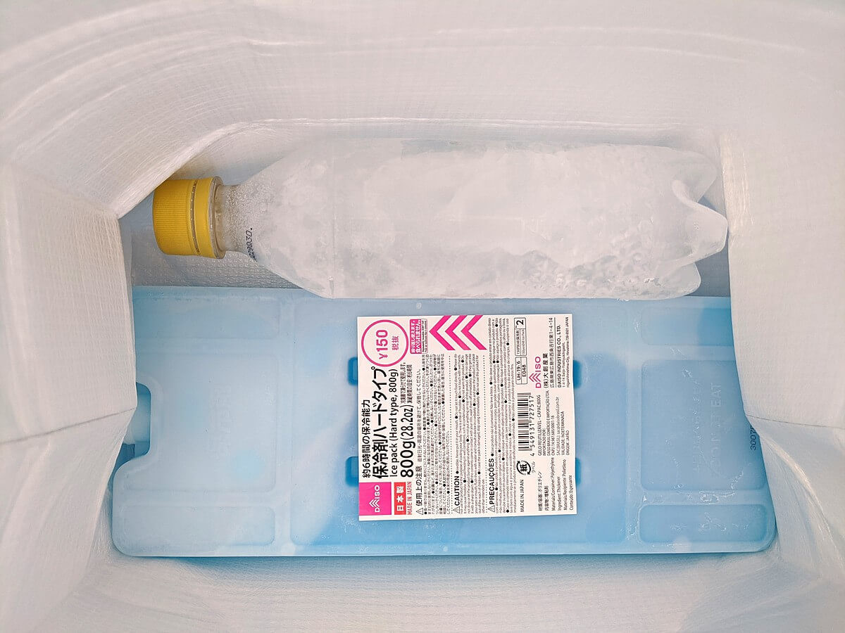 12時間が経過したところで、凍らせたペットボトルの水が完全に溶けました。 ハードタイプの保冷剤も溶けてはいますが、まだ一部凍った部分があります。