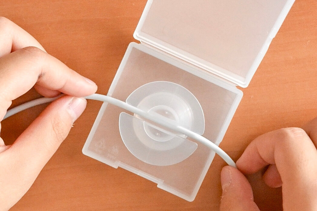 ポリプロピレンケーブル収納は、その名の通りUSBケーブルをすっきりまとめる収納ケースです。2タイプ(角型、スタンド付き・角型)販売されていて、どちらも税込190円。