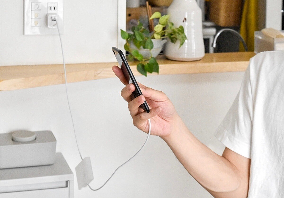 セットした後は左右から出ているケーブルを両方引っ張ると長さ調節ができるので、充電しながら使う際もスムーズです。