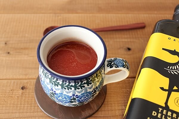 オリーブオイルはどうしても浮いてしまいがちですので、スプーンで混ぜながらいただいて下さいね!