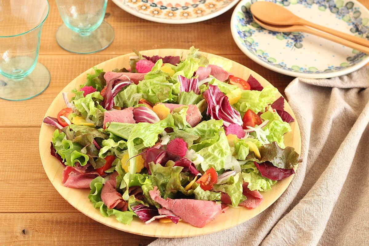 たっぷりのレタス類にオニオンスライス、そしてスライスしたマッシュルームに塩、ブラックペッパーをかけ、テラデリッサのオリーブオイルを回しかけたサラダが、シンプルでとても美味しいです!