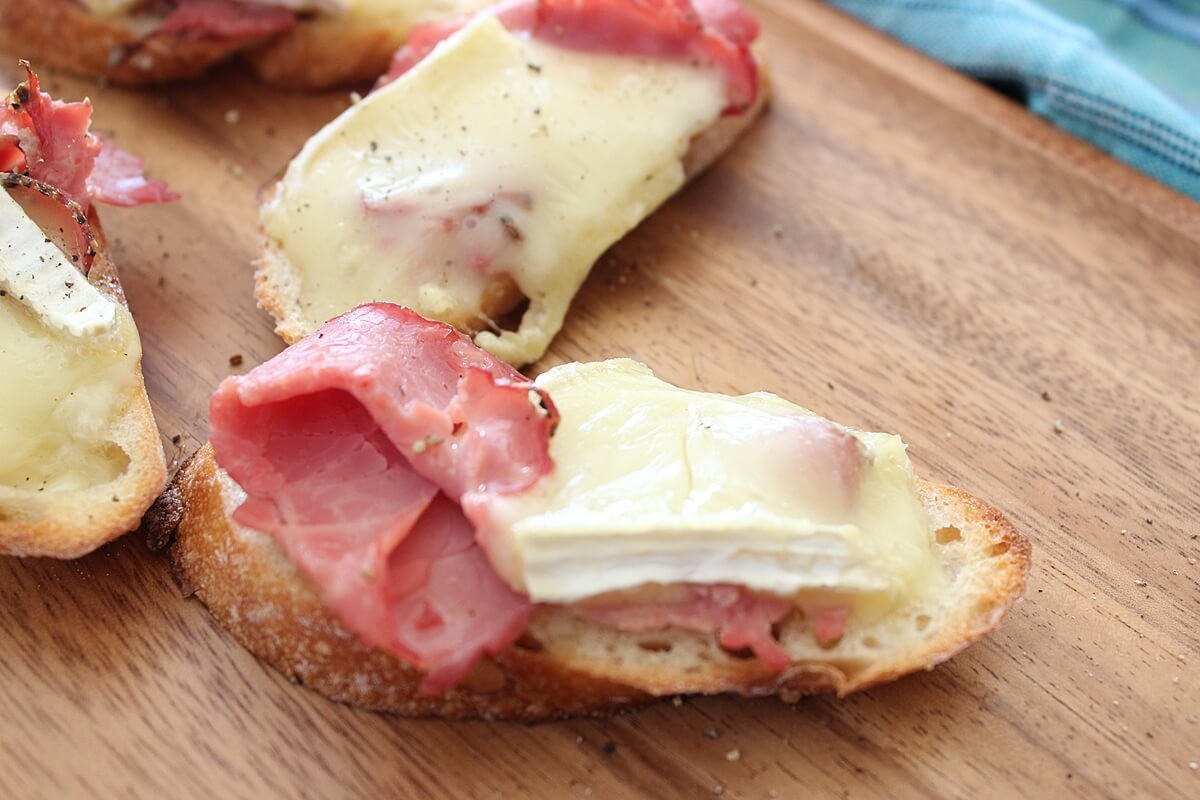 薄めに切ったフランスパンにオリーブオイル少々を塗り、パストラミビーフとブリ―チーズをのせて加熱するだけ!簡単でおすすめです。