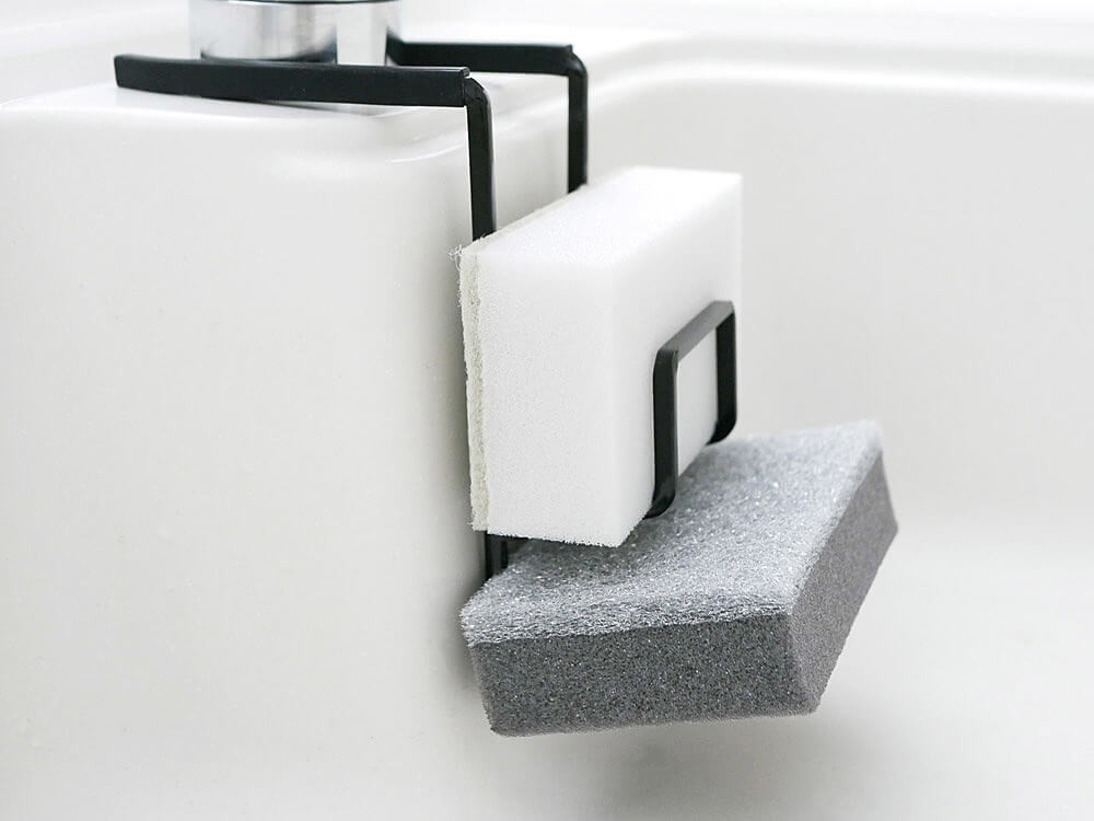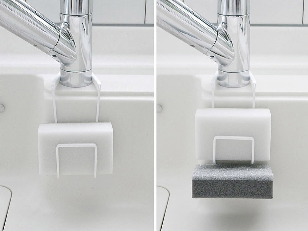 しかも、スポンジがずれ落ちることなく、ひっかけるだけなのに水切れ抜群で機能性も◎。食器スポンジ1つだけ用の「シングル」と2種類のスポンジを使い分ける用の「ダブル」。