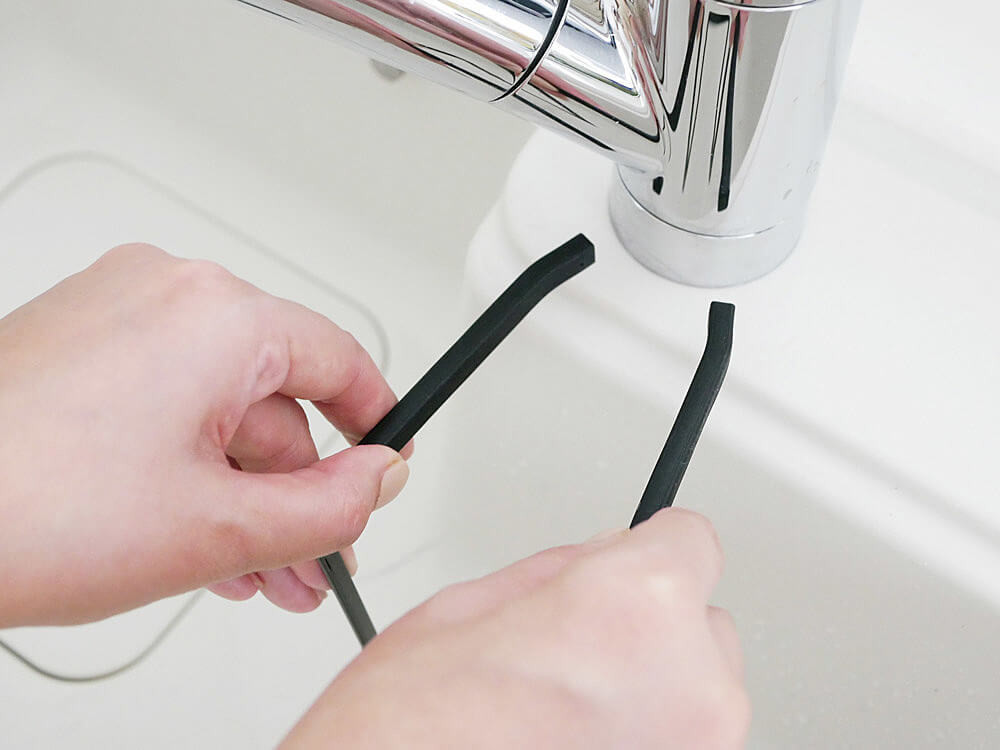 初めて見た時は、これ何に使うの?とシンプルすぎるルックスに想像もつかなかったのですが、蛇口に挟んで納得!