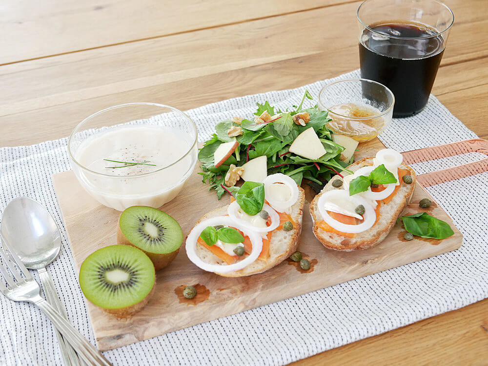 素朴な風合いのカッティングボードに、オープンサンドをのせるだけで絵になる特別な雰囲気を演出できるのも、最大の魅力。