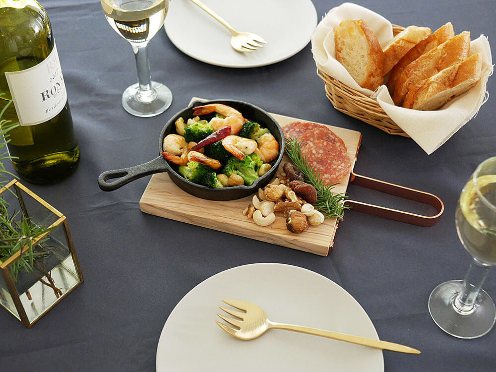 肉料理や魚料理、ピラフなど。カッティングボードに鍋ごとのせて、豪快な雰囲気を楽しめますよ。