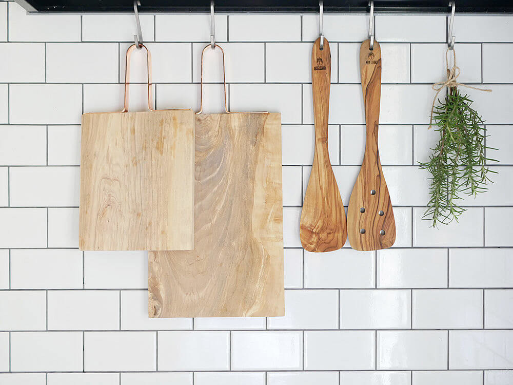 使用後、キッチンで乾燥させている時にも、オシャレな魅せる収納になります。奔放に描かれたアートのような、オリーブならではの美しい木目がキッチンを彩ります。
