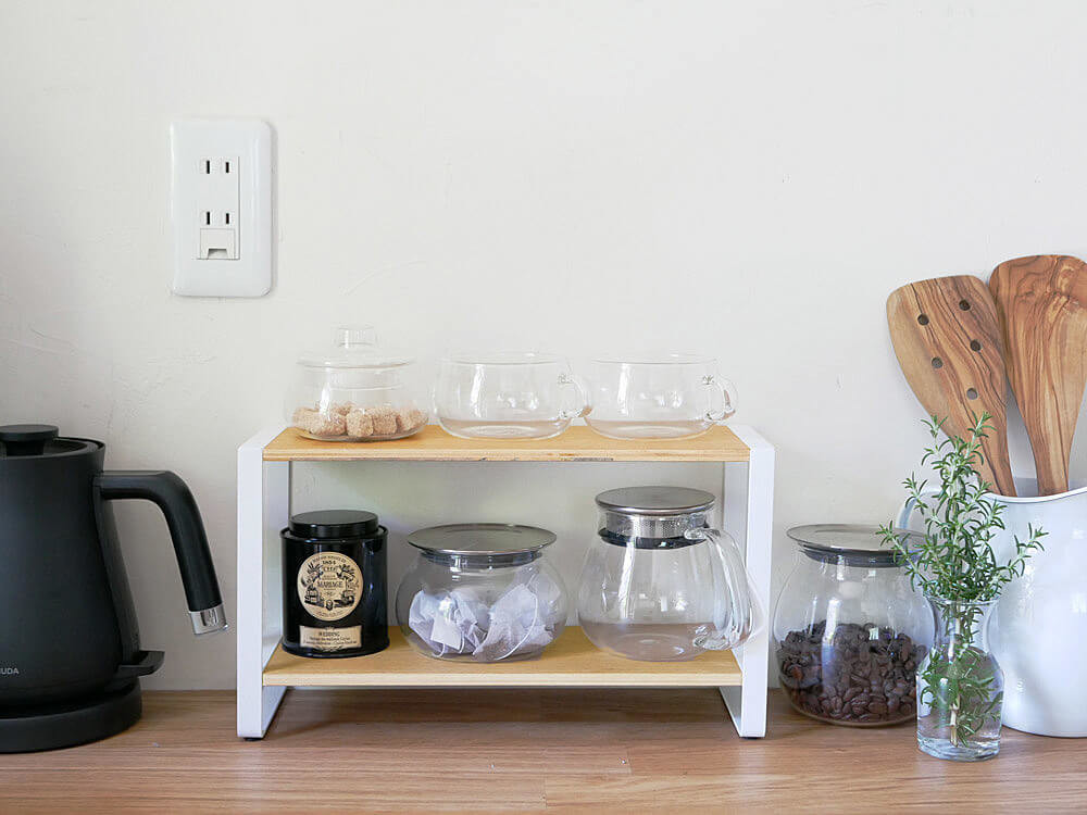 カップボードなどでティーセットを並べても◎。 お気に入りのグラスやマグ、紅茶をディスプレイするように魅せる収納にもできますね。