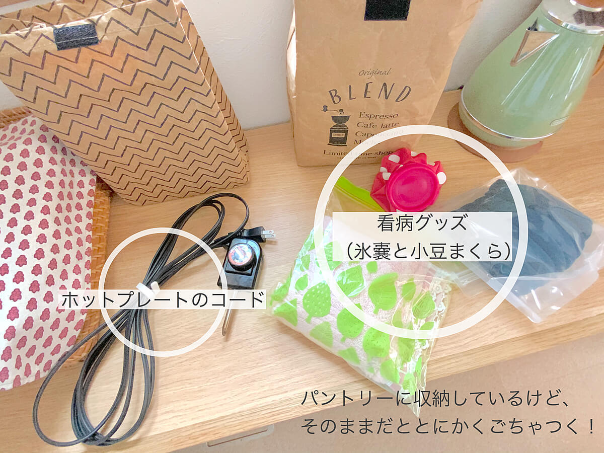 使用頻度は多くはありませんが、小豆枕はレンジで温める必要がありますし、氷嚢は氷を入れるので、どれも使用場所(キッチン)に置いておく必要があります。