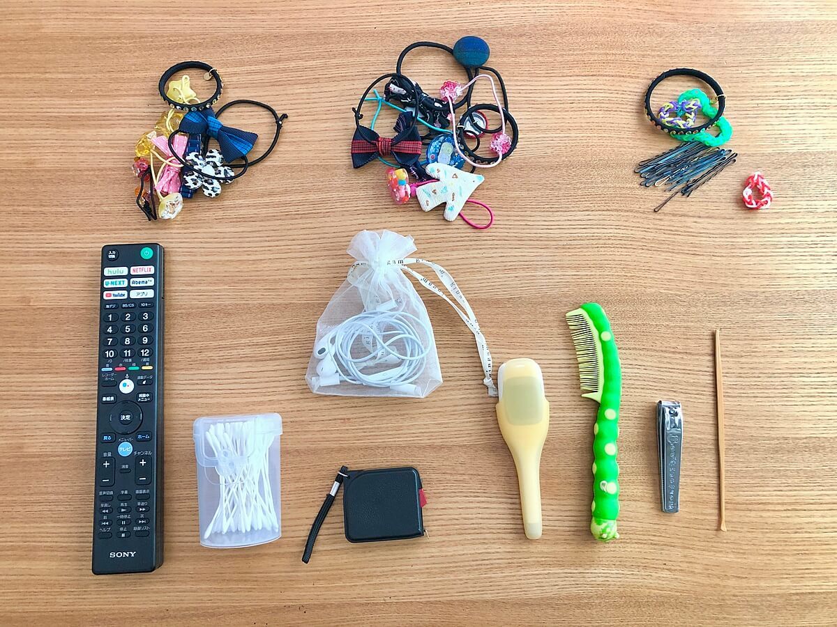 娘たちのヘアゴムとブラシは一緒に使用する物なので、隣り合わせに配置しました。耳かきと綿棒も同じカテゴリーに。