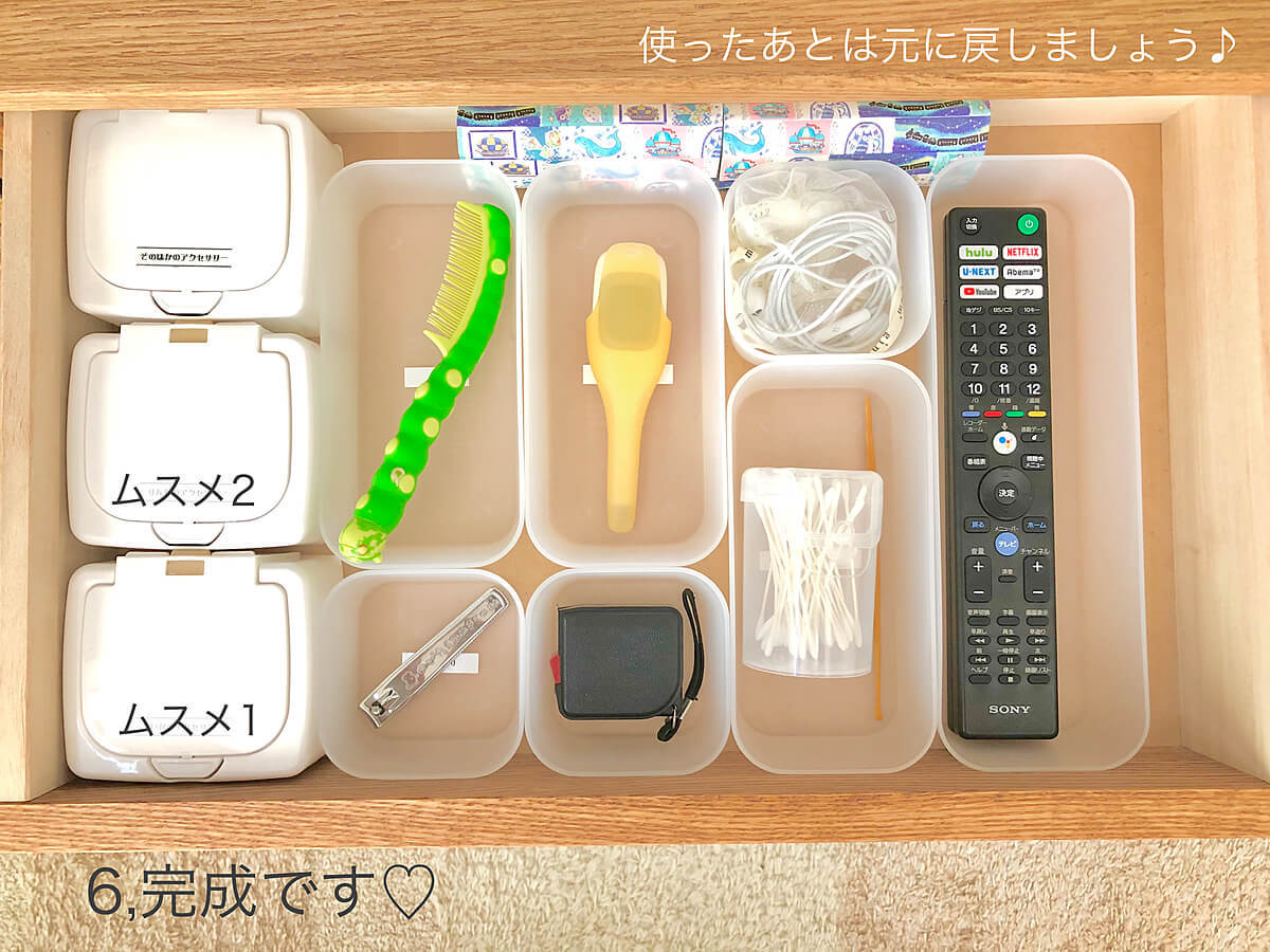 今回はテレビボードの引き出しを使ってご紹介しましたが、場所が変わってもこの収納の手順で行っています。