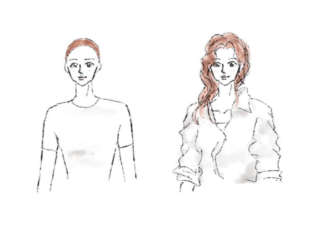 イラスト左のようなシンプルな白Tシャツは、一歩間違えると体操着。髪型も、ひっつめ髪より無造作な感じがとてもよく似合います。