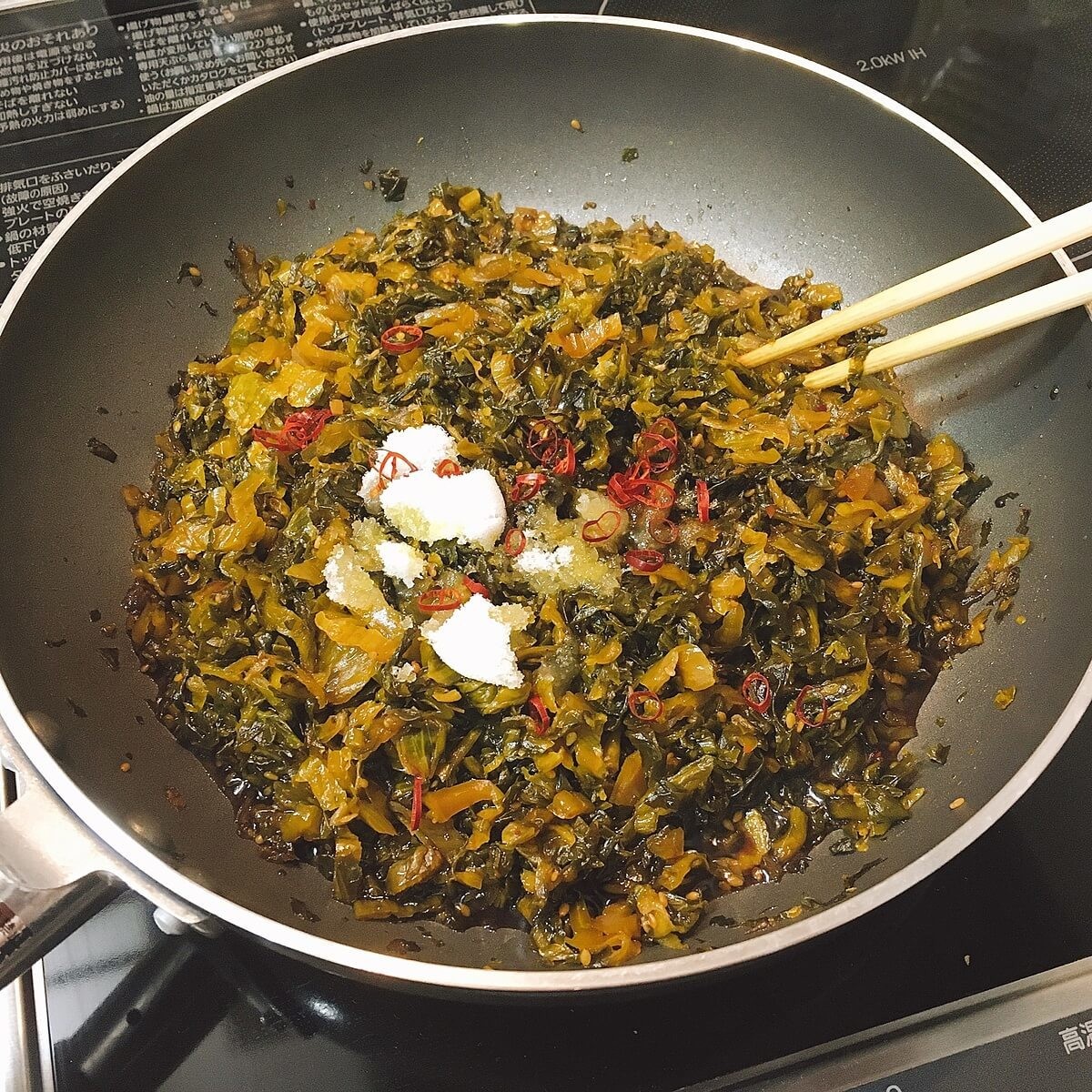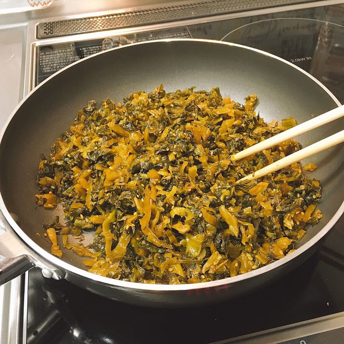 - ゴマ油を熱したフライパンで、高菜を炒める