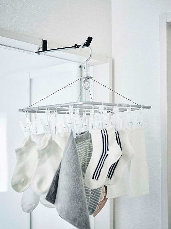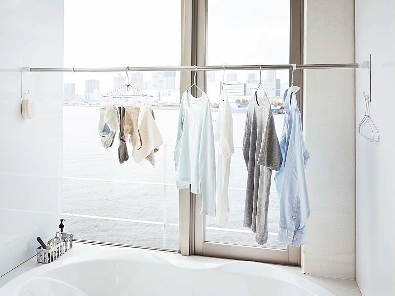 鴨居や浴室扉の上枠にちょい足しできるので、”浴室に入りきらなかった分”、”週末オシャレ着洗いした分”、”来客時に見えないところに干したい分”、”汗をかいて着替えが多かった翌日”など、あらゆる部屋干しシーンで頼りになります。