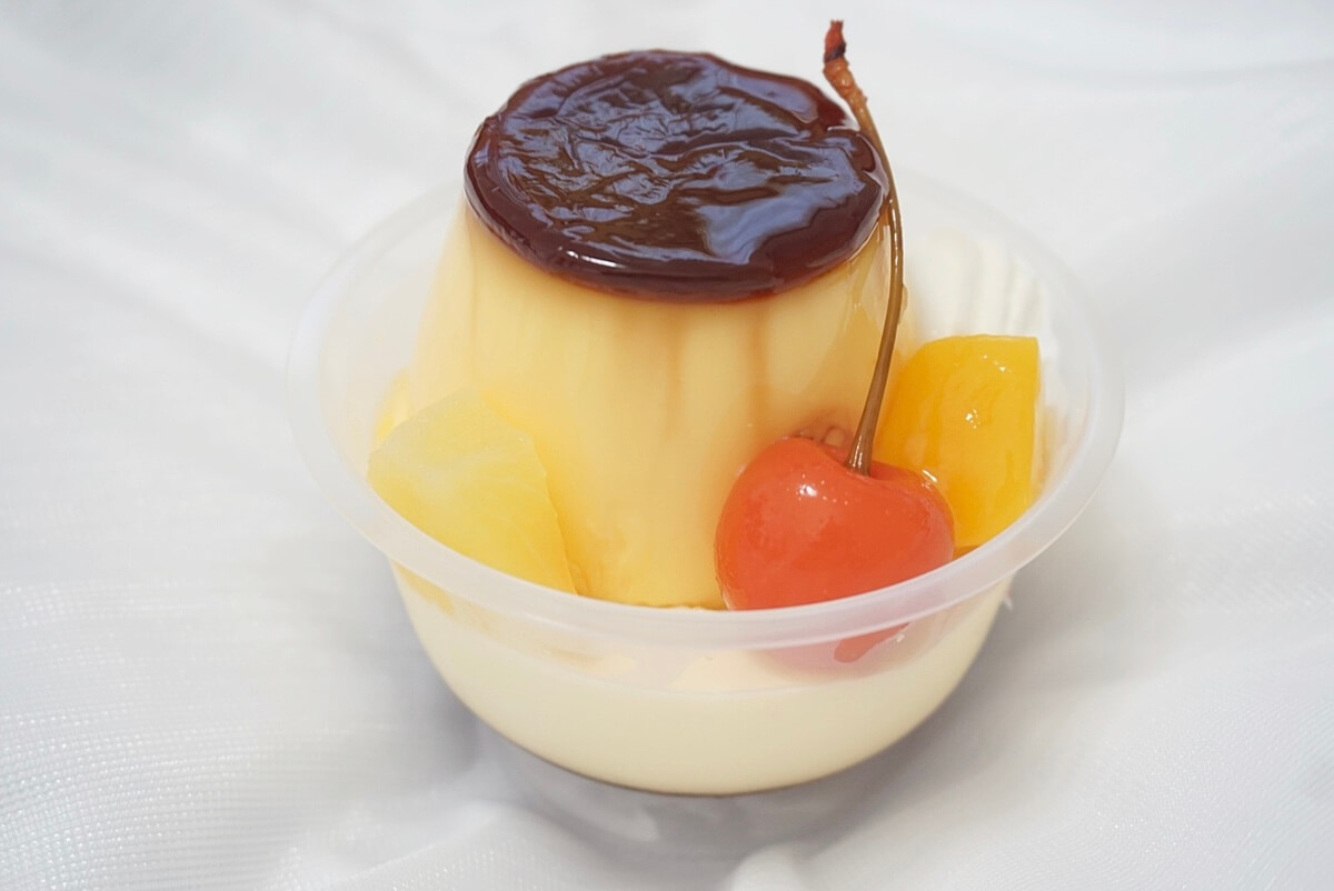 ほろ苦いカラメルゼリー、スポンジ、プリンムースに、練乳を加えたコクのある味わいのプリン、ホイップクリーム、さくらんぼ、黄桃、パインがのった豪華なスイーツです。