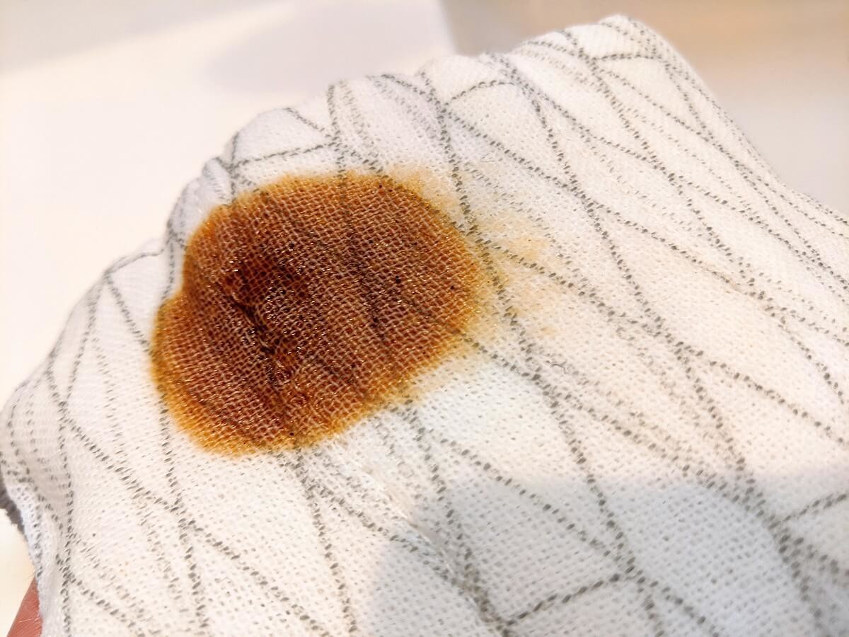 買ったばかりのお気に入りのふきんを汚すのは躊躇しましたが(笑)。 きっと落ちてくれるだろうと信じて、シミになりそうなソースを拭き取ってみることに……。