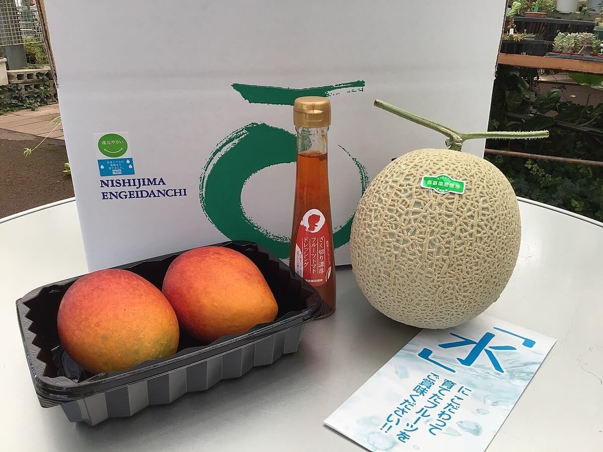 年間を通して高温多湿、冬も温暖な気候のもと太陽の恵みをいっぱいにうけたメロン、旬のマンゴーとトマトをたっぷりと使用したトマトドレッシングのセットが届く。
