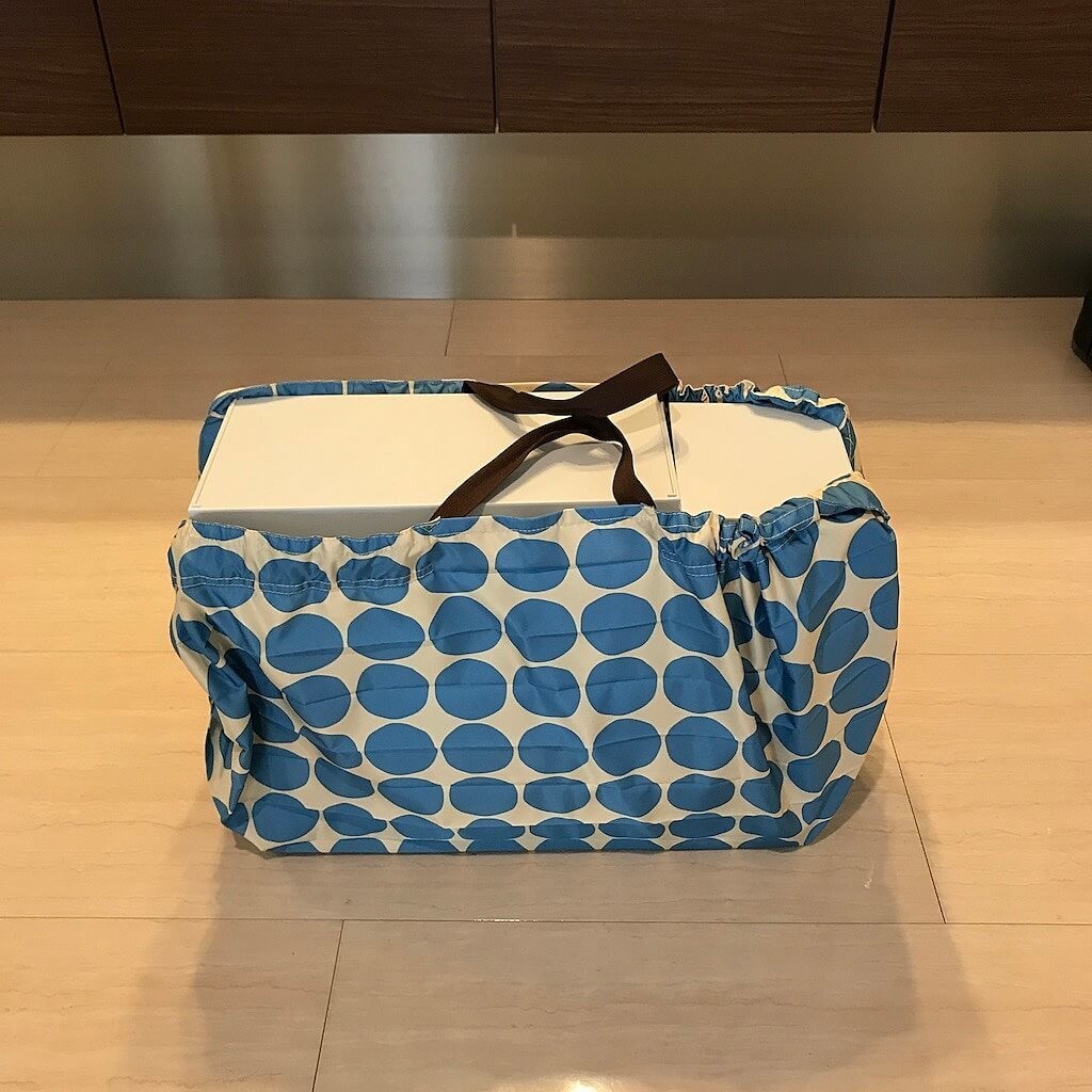 いろんなサイズがありますが、今回特におすすめするのはLサイズ。レジカゴにセットできる大きさのものです。←若干足りないけどまぁいけます。