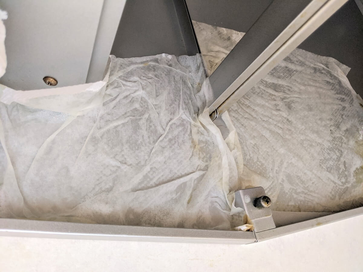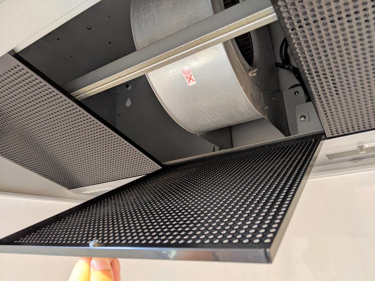 換気扇のフィルターを取り外します。 フィルターのつまみをグッと下に押したら簡単に外れました。