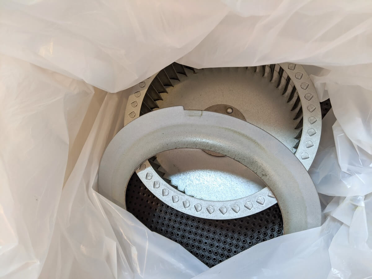 我が家はリング型のカバーがネジで固定されていました。 その場合はカバーをまず外し、そのあとにネジを回してドラム型ファン(シロッコファン)を取り外します。