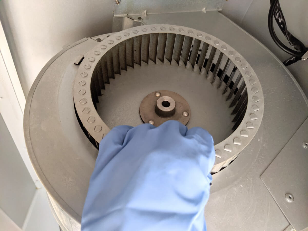 ファンに付いているネジは、通常の左回しではなく右回しで外すタイプが多いようです。 部品が尖っていることもあるので、安全のためゴム手袋をしてください。