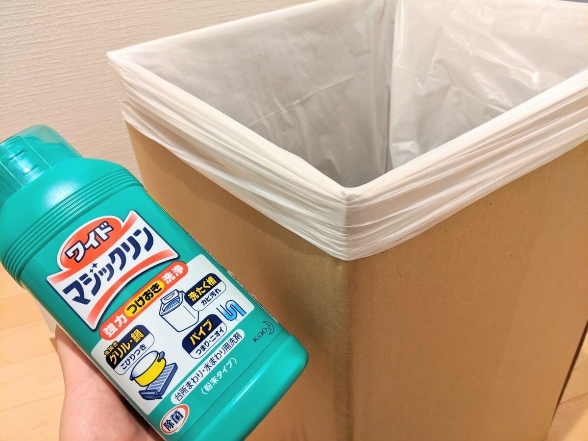 つけ置き洗いをする際にあると便利なのが、部品が入る大きさのダンボールです。 ここにゴミ袋を二重掛けして使用します。