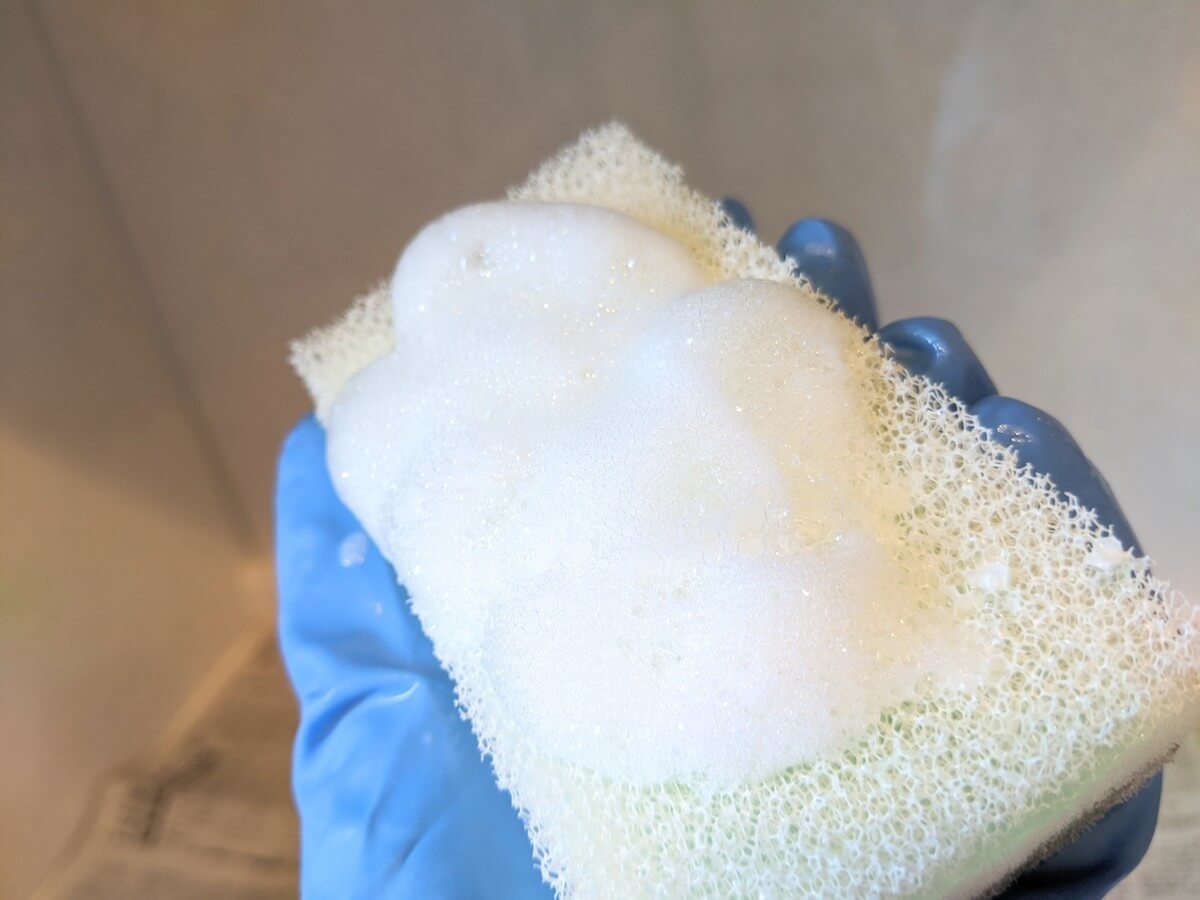顔より上にスプレーをすると吸い込んでしまう可能性があるので、スポンジに洗剤を塗ってから内側部分に塗布します。
