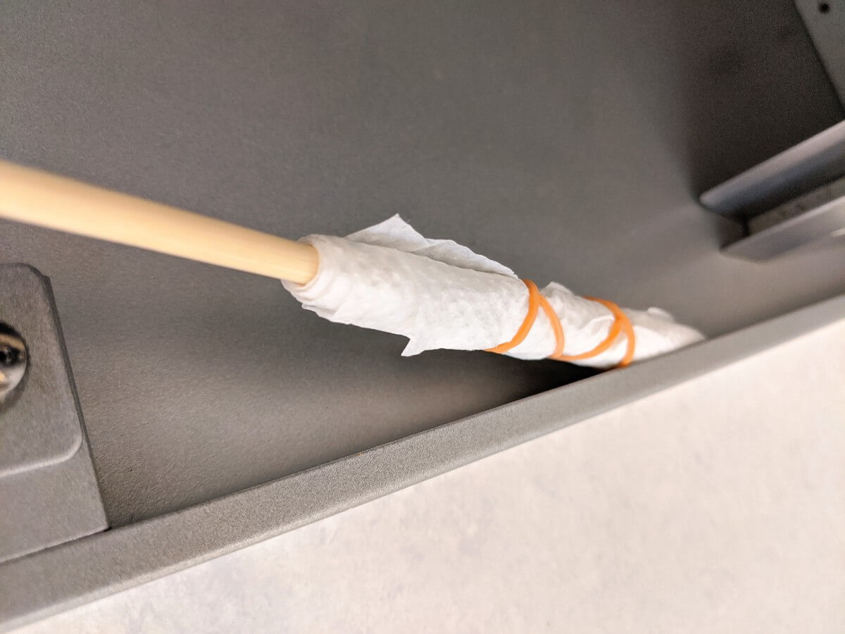 油受けの溝のお手入れは、キッチンペーパーを巻き付けた割り箸を使うと便利です。 溝に沿って擦り取るようにすると、油汚れがごっそり取れます。