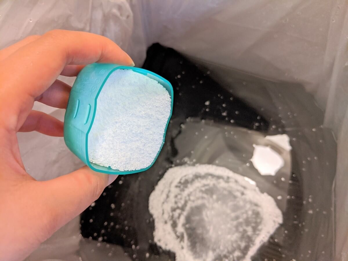 さらにダンボールの底の端を一カ所だけカットしておくと、下から汚水が流せるので便利ですよ。 洗剤はつけ置き用の粉末タイプも用意しました。