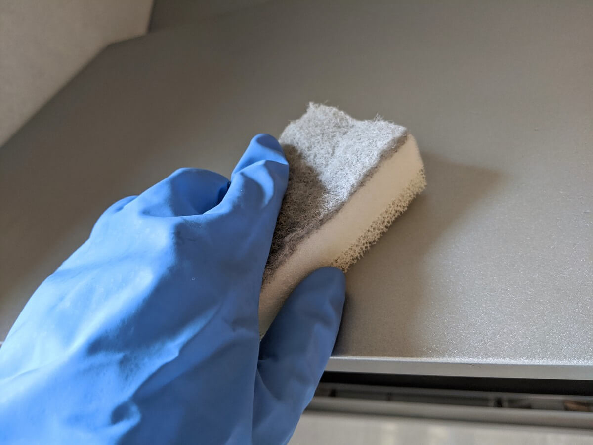 フード表面は傷つきやすいため、柔らかいスポンジを使って汚れを落とします。 内側と同様にスポンジに洗剤を塗ってから塗布します。