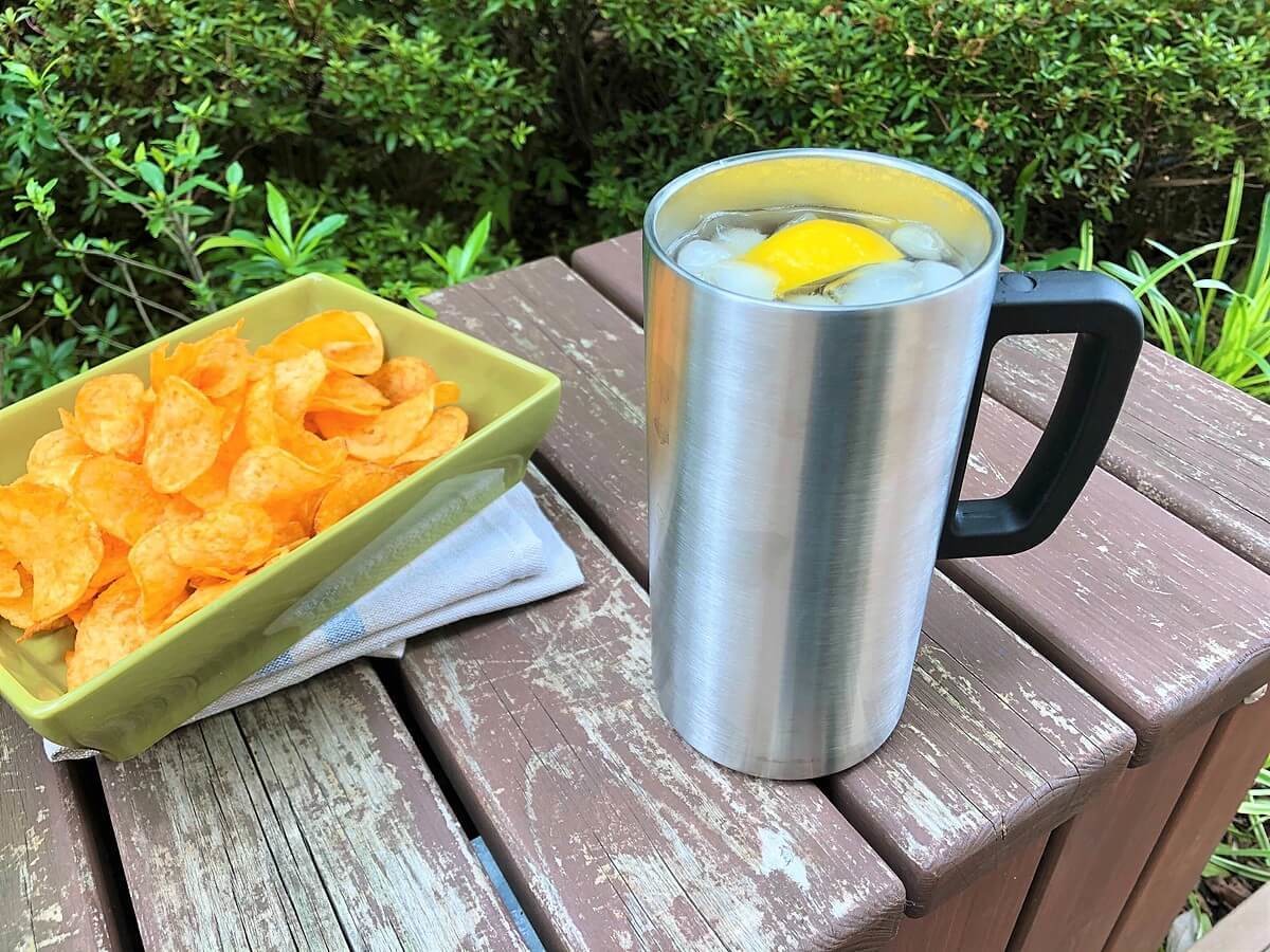 そこで取り入れたのが、お酒を最後までおいしく飲むための「特別ジョッキ」、メガサイズの「ステンレスジョッキ」です。 750㎖サイズなので、500㎖缶ビールもすべて注ぎきれるため、ちびちび注ぎ直す手間がなくラクちん。