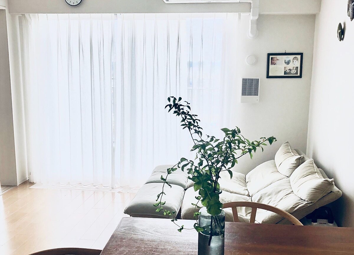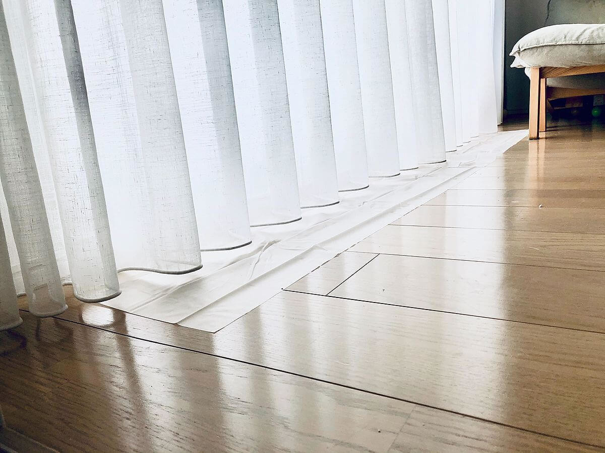 レースカーテンの代わり、または窓とレースカーテンの間に取り付けるだけ。10~15㎝ほど床に垂らして使います。簡単にカットできるので長さの調整もラクラク。