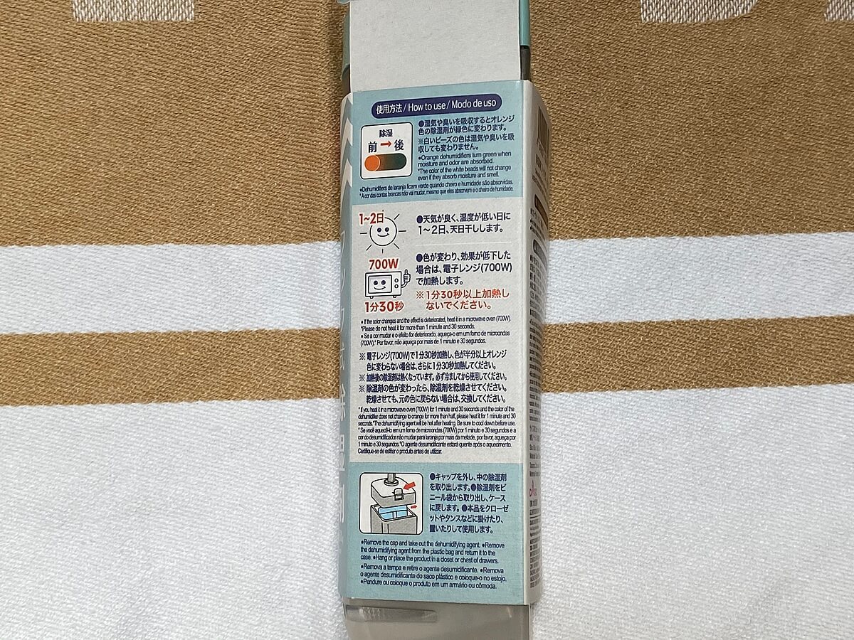 除湿剤は約30グラム。ちょっと少なく感じますが、それでも私が使う理由は、繰り返し使えること。たとえ100円とは言え、コスパは大事ですよね。