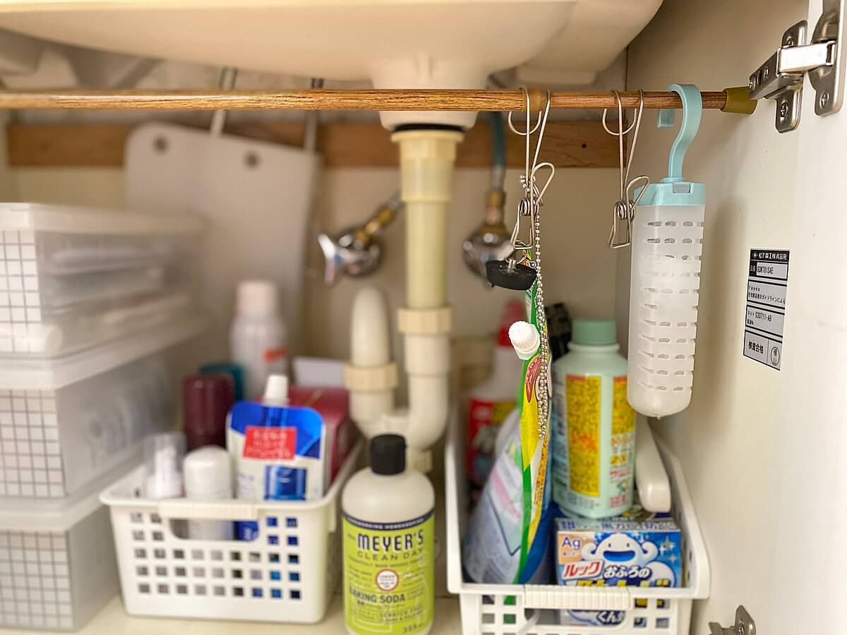 当たり前ですが、水回りの収納は湿気が溜まりやすいですよね。洗面台下の収納もその一つ。扉を開けるたびにもわっとした湿気臭が漂うのが気になっていました。ここには突っ張り棒をして、除湿剤を吊り下げています。