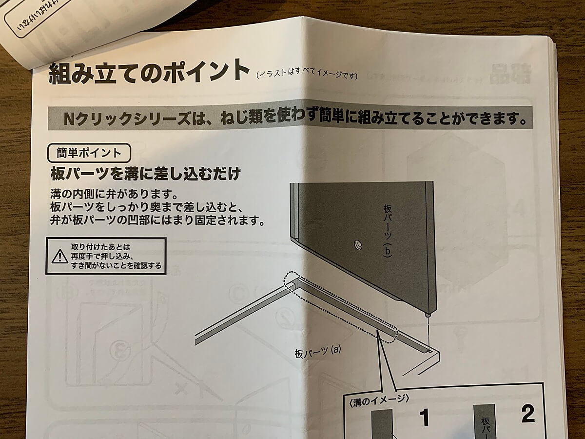 従来のカラーボックスに比べ、組み立て時間が約3分の1で完成するという簡単さが売りのNクリックシリーズ。工具などは一切不要なので、DIY初心者でも簡単に組み立てられます。