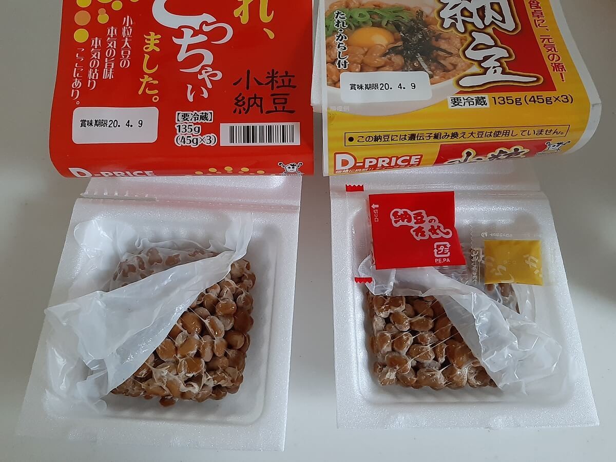 納豆の豆はどちらも同じで、たれが「あり」か「なし」かの違いです。