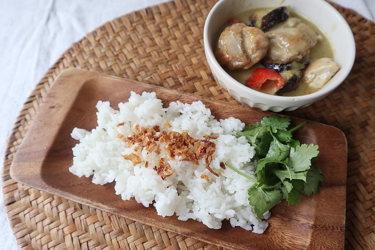 市販のグリーンカレーのご飯にパラりとするだけで、節約とは感じさせない映えメニューに。