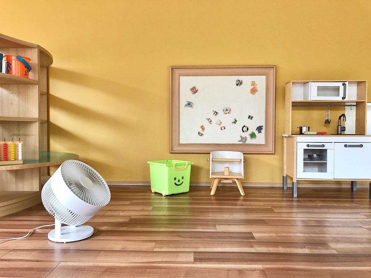 せっかくエアコンをつけても、冷たい空気は下に、温かい空気は上に流れてしまいます。扇風機やサーキュレーターを回し、空気をかくはんして、室内の温度を平均的に保ちましょう。冷却された空気が床の近くにたまると、乳幼児の体調にも悪影響を与えます。
