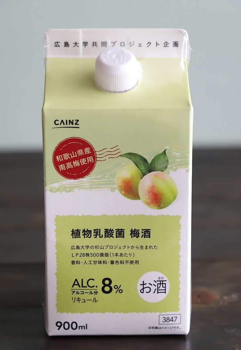 広島大学とカインズが共同研究し、「杉山プロジェクトから生まれたLP28株が1本あたりに500億個配合されている(1本あたり)」 梅酒なのです。