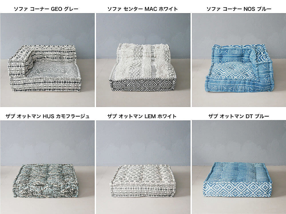 L字型に背もたれが付いた「コーナー」、背もたれのある形でシステムソファの真ん中として使える「センター」、大きな座布団の形「ザブ」の3種類。柄は6種類。