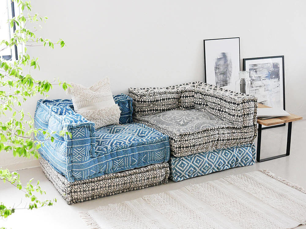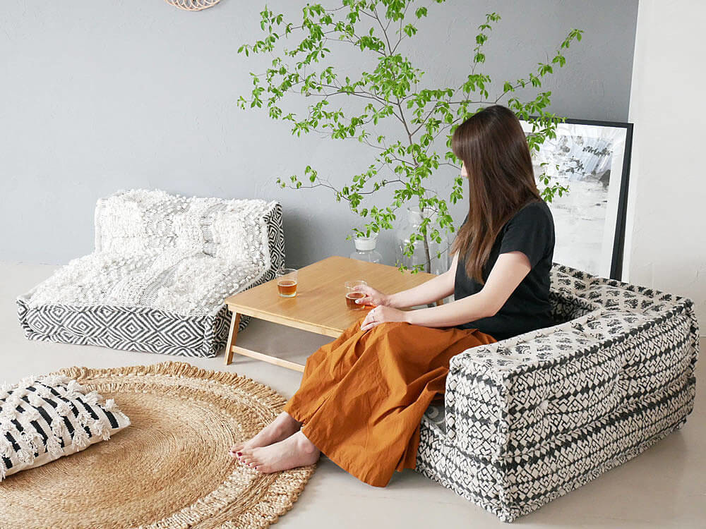 L字型コーナー、センターの2種類で、ゆったりとしたリラックス、ローソファに。気軽に移動できお洒落でリッチな座布団へ。