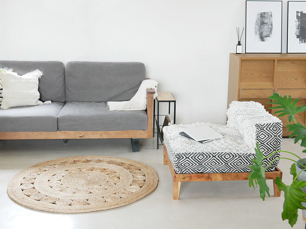 システムソファ専用のウッドベースを使えば、高さがあまりないソファやザブオットマンに高さを出すことができます。