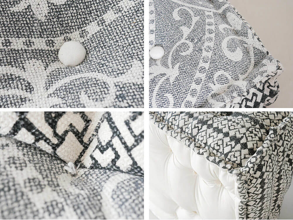 強度を保つための縫い付けなど、くるみボタンやステッチがアクセントになっており、細かいところまで丁寧に造られています。