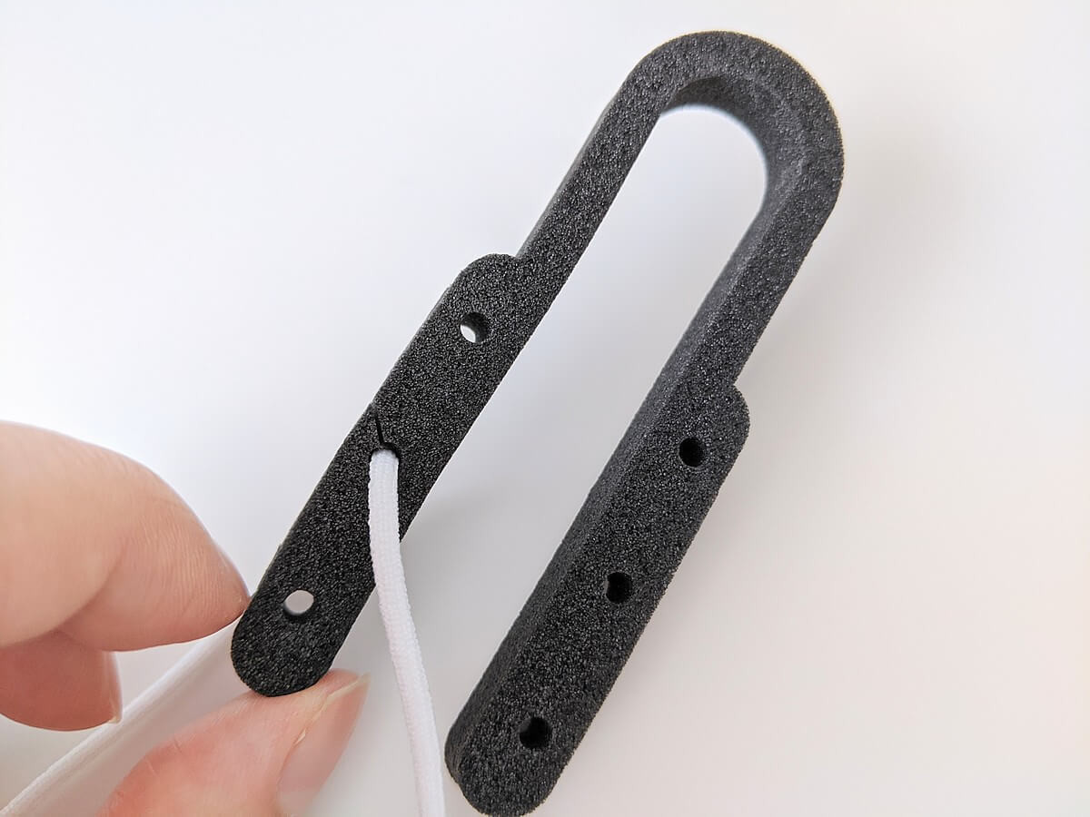 最後にマスクやひもの位置を微調整したら完成です。 マスクが下にずれたりキツく感じたりする場合は、調整穴の位置を変えてみてください。