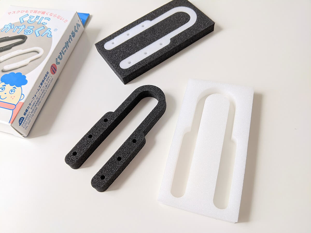はじめに、「くびにかけるくん」はゴムひもタイプのマスク用で、ひもが伸びないマスクには使用できないのでご注意ください。